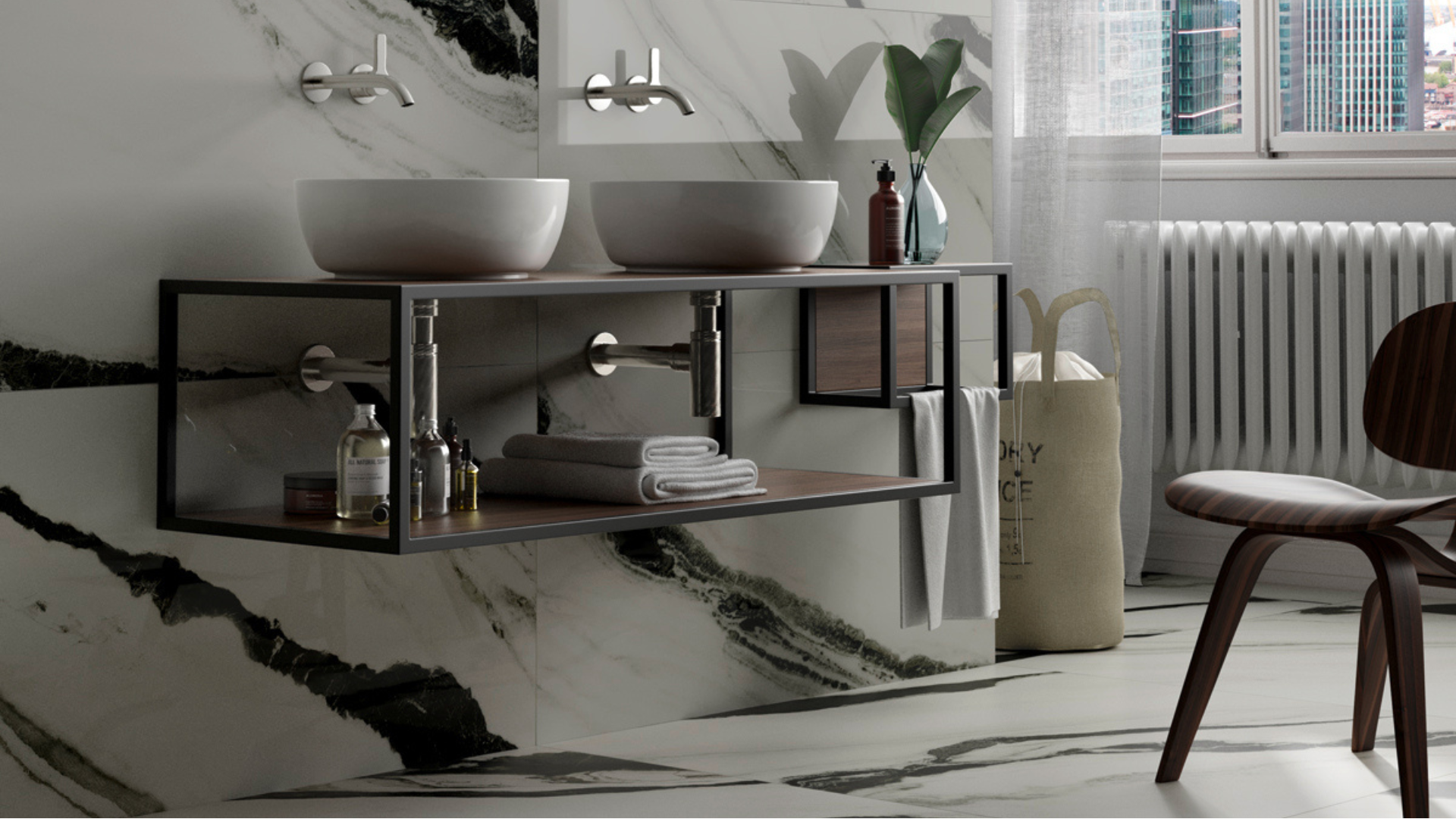 Białe płytki o wyglądzie marmuru to synonim czystości i luksusu. Łazienka z czarną armaturą w stylu nowojorskim z jasnymi płytkami wygląda bardzo elegancko. Dodatkowo efekt, który charakteryzuje się żyłami podobnymi do tych występujących w naturze, świetnie komponuje się z innymi naturalnymi materiałami, takimi jak drewno czy imitacje betonu.