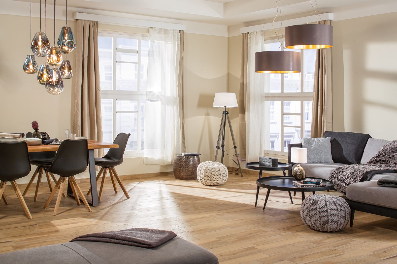 To wciąż niesłabnący trend w aranżacji wnętrz. Naturalne drewno zawsze będzie dobrym wyborem, zarówno w postaci drewnianych desek, jak i w przypadku paneli laminowanych czy solidnych paneli winylowych, imitujących naturalne drewno. Przykładem jest np. kolekcja Parc De Parcy, Charme Parquet. W ofercie Grupy Mo dostępna jest szeroka paleta wybarwień nowoczesnych paneli winylowych – od bieli, przez beże i jasne brązy, po egzotyczne i ciemne odcienie.