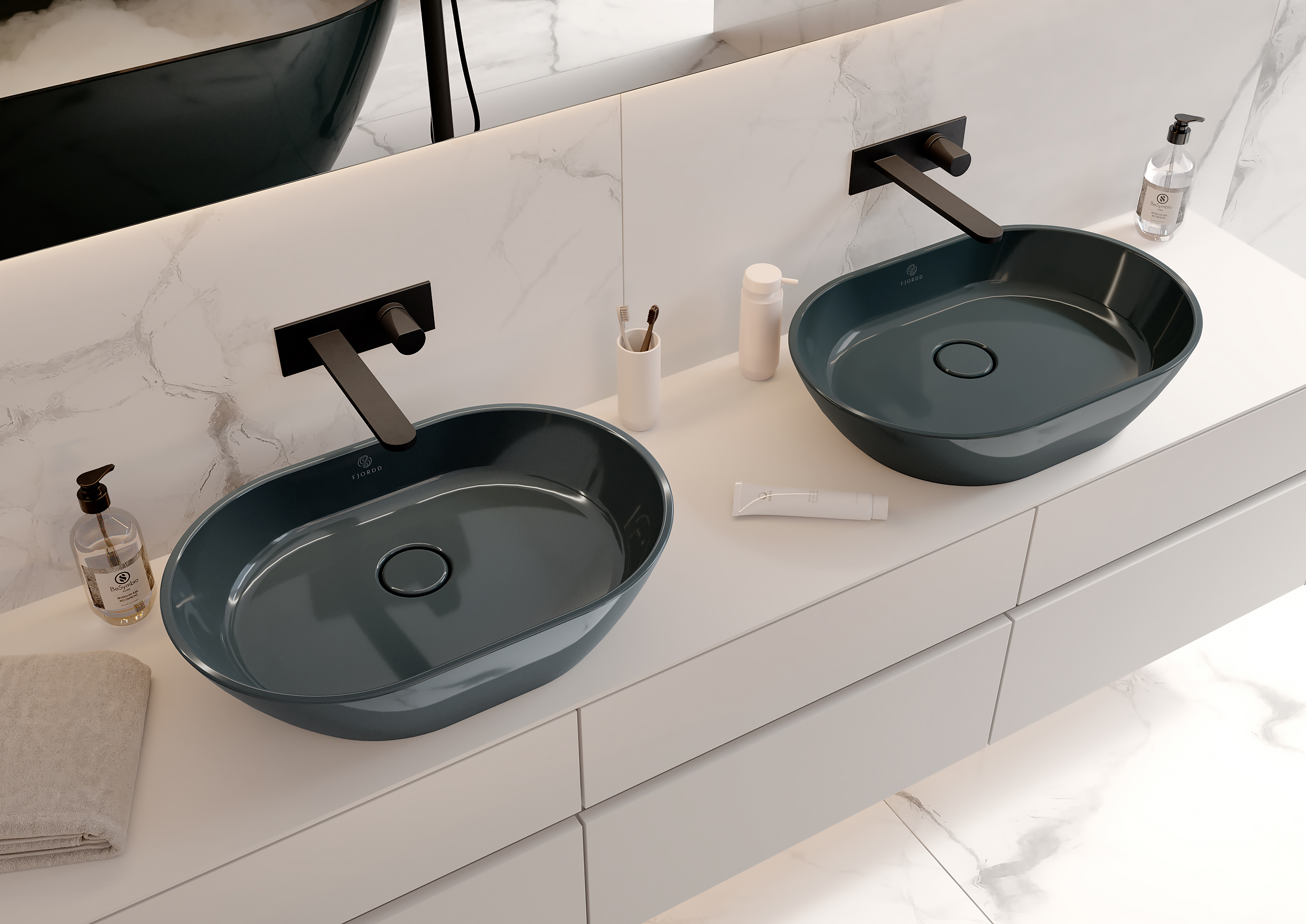 A co z łazienkami dla par? Wtedy warto zdecydować się za zakup dwóch umywalek nablatowych tej samej linii. Można je umiejscowić dowolnie na blacie, wybierając mniejsze lub większe modele w zależności od ilości wolnego miejsca. Ponadto ze względu na mnogość wzorów i kolorów mogą powstać dwie strefy mycia – dla niej z umywalką w kolorze pudrowego różu i dla niego z czarną umywalką nablatową. Wspólnym mianownikiem będzie złota bateria sztorcowa. Dwie umywalki są rozwiązaniem wygodnym i praktycznym. Niektórzy są skłonni poświęcić jedną dużą umywalkę na rzecz dwóch mniejszych.