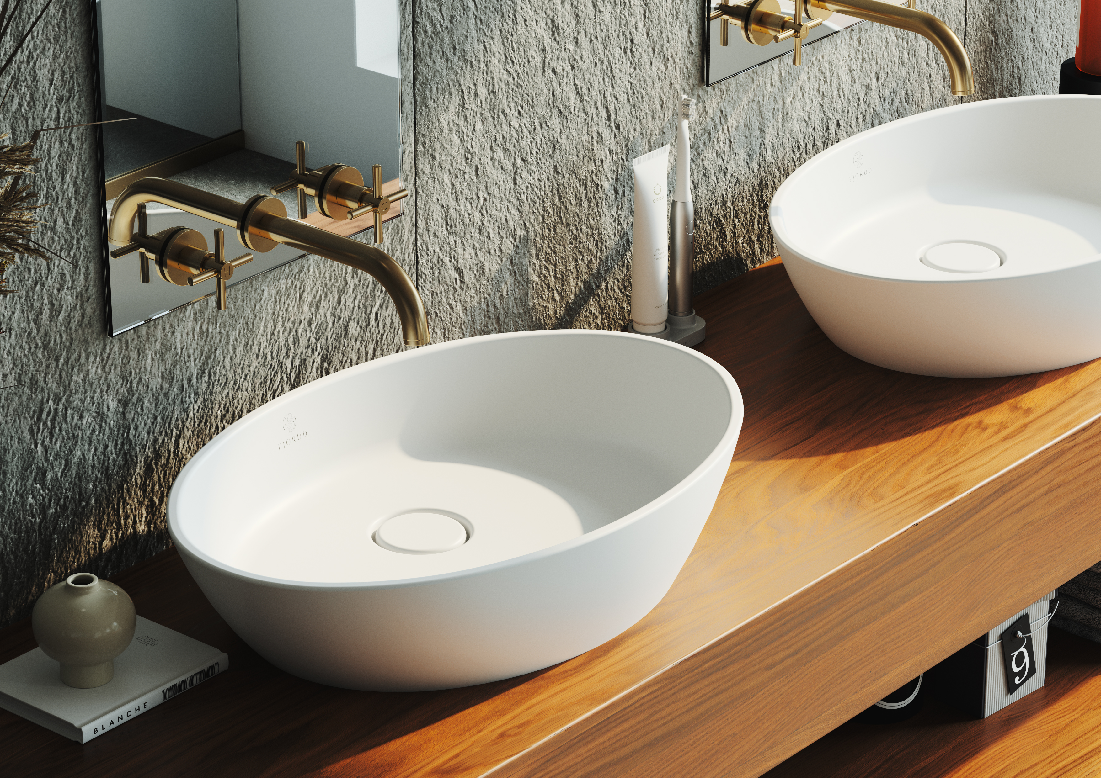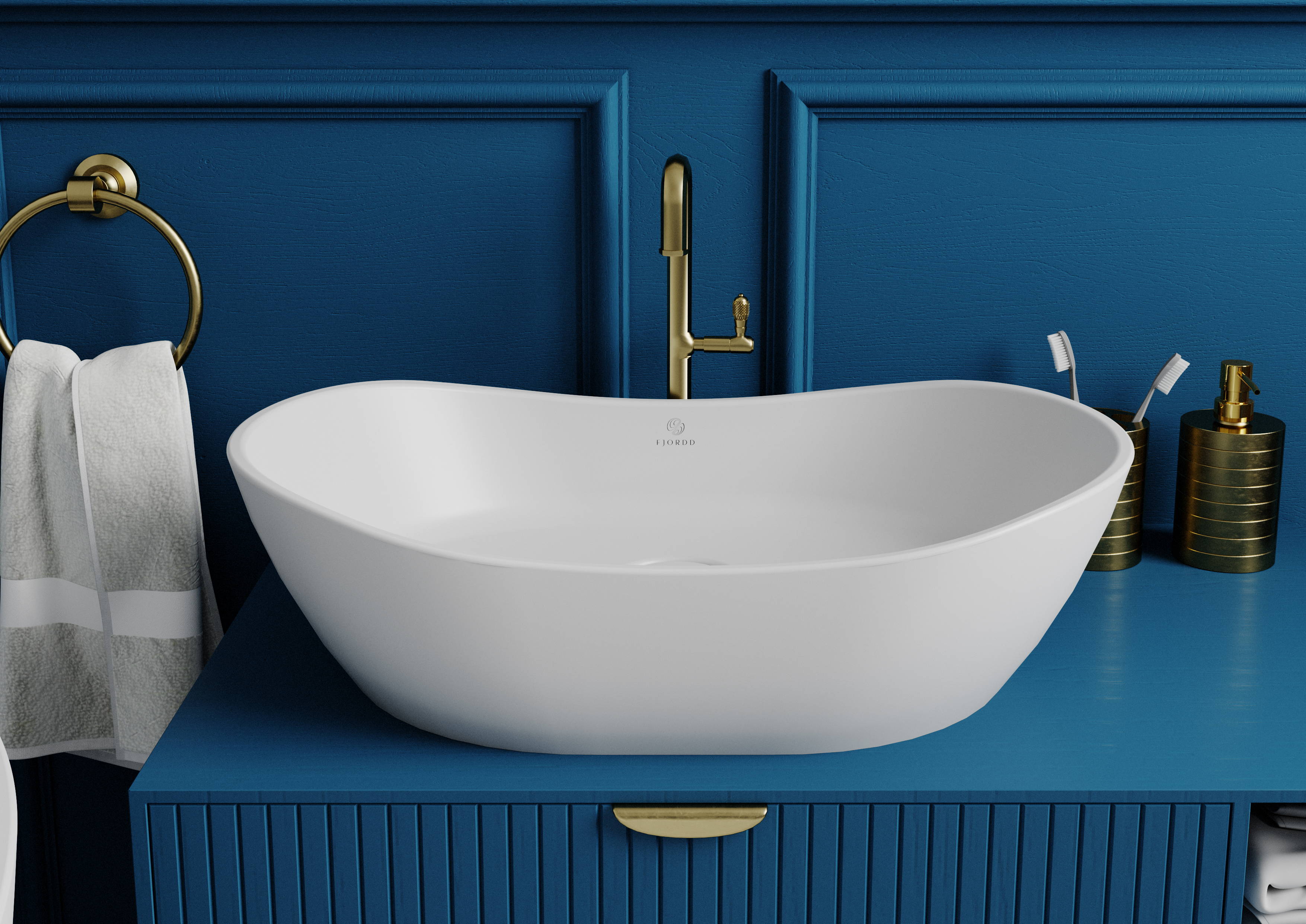 Może być matowa i na przykład w kolorze różowym tak jak ta z serii Slim 40, HushLab i będzie wyróżniającym się elementem wnętrza. Idealnie komponuje się ze złotą baterią i ciemnym drewnianym blatem z czarnym frontem. Pasować będzie również do industrialnego wnętrza z betonowym blatem. W wersji glamour może pojawić się na szklanym blacie w towarzystwie również czarnej baterii.
