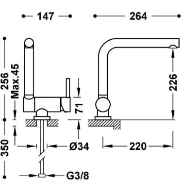 Wężyki elastyczne G3/8.· Całkowita wysokość z opuszczoną wylewką 7,1 cm.