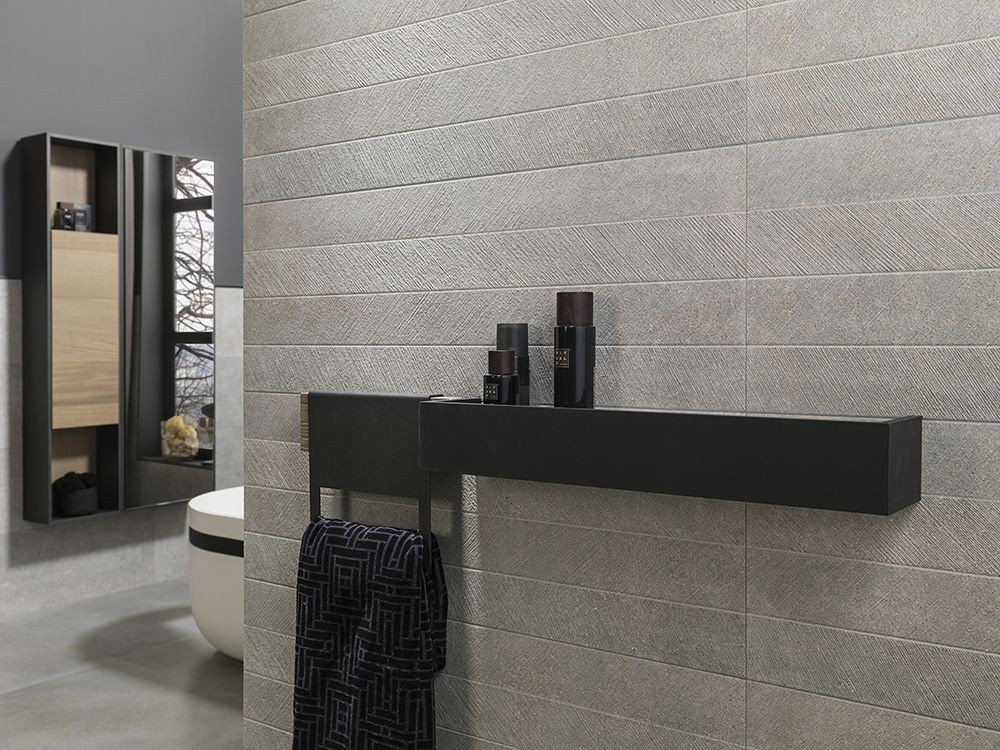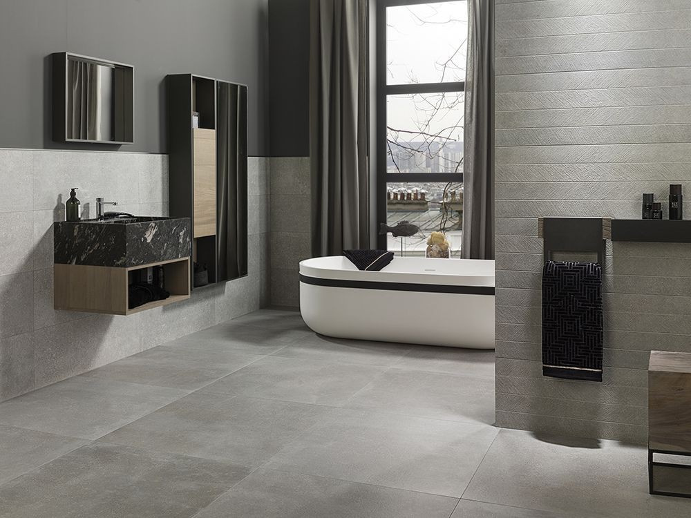 Płytki w kolorze szarym, matowe, co sprawia że powierzchnia jest mniej śliska i bardziej odporna na ślady palców i zabrudzenia.
