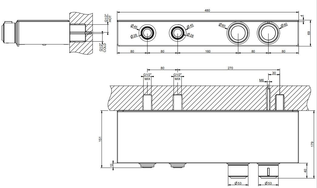Część zewnętrzna do termostatycznej baterii półkowej dla dwóch oddzielnych funkcji, z przyciskiem włączania/wyłączania.