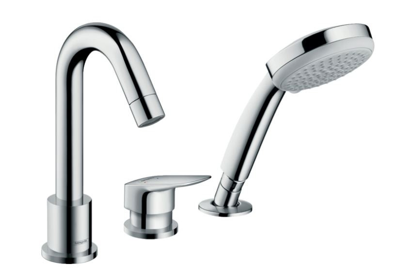 Logis 3- otworowa bateria wannowa firmy Hansgrohe. Zestaw składa się z elementów zewnętrznych: wylewki, uchwytu oraz słuchawki prysznicowej, które montuję się na brzegu wanny. W komplecie znajdują się rozety maskujące.