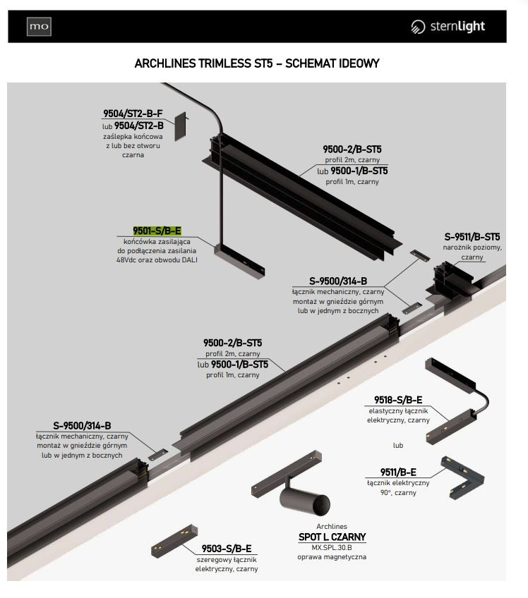 Zasilanie 48Vdc wprowadza się do profili Archlines za pośrednictwem końcówek zasilających czarna 9501-S/B-E lub biała 9501-S/W-E.