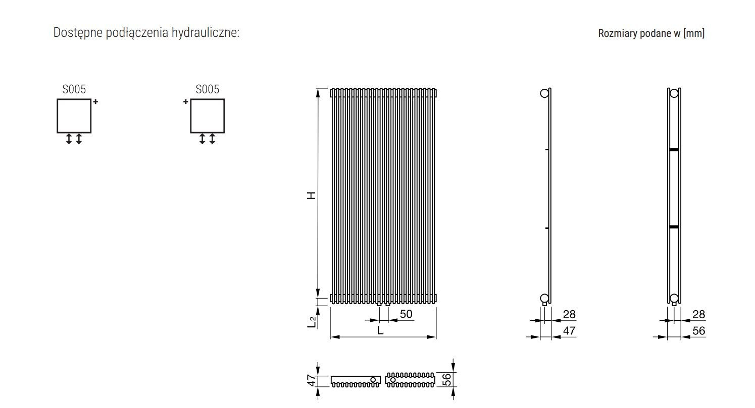 Nowoczesny i stylowy grzejnik wodny o mocy 227W wykonany ze stali, podłączenie dolne środkowe S005.