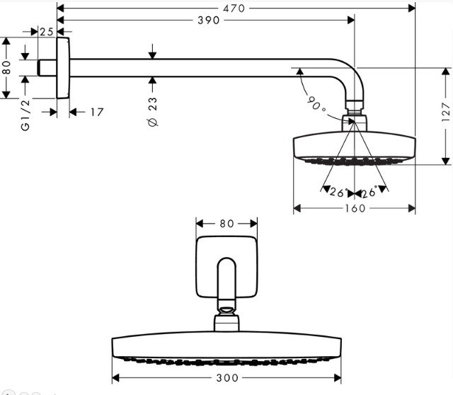 Deszczownica 30x160 cm, a ramię mierzy 39 cm z ramieniem do montażu ściennego.